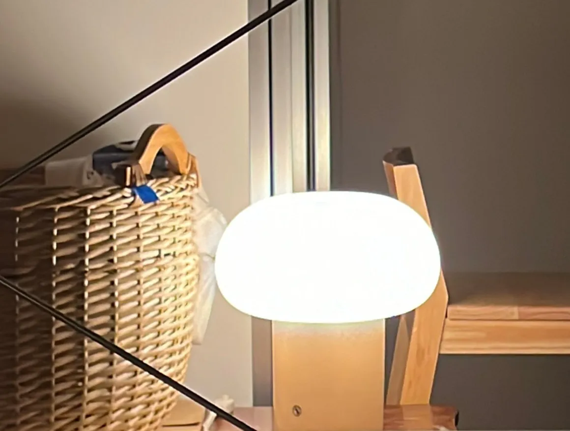 Es una lámpara hecha de vidrio coloreado en blanco que, por sus dimensiones y forma de honguito, se vuelve encantadora y puede ponerse prácticamente en cualquier rincón del hogar, ya que cabe perfectamente en repisas o mesas pequeñas.