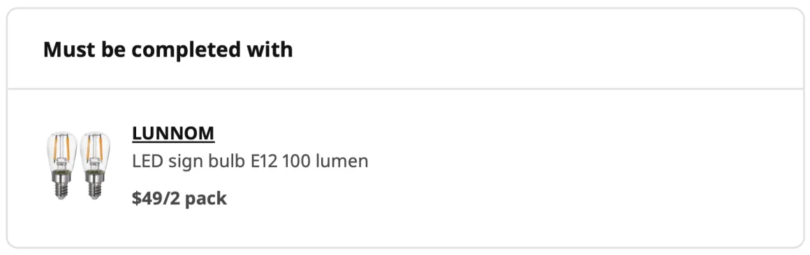 Atención con la medida del foco que utiliza. Al ser una lámpara de formato miniatura, requiere un foco con una base E12. Para evitar dolores de cabeza, les recomiendo comprar alguna de las opciones que venden en IKEA, el paquete de dos bombillas tiene un precio de $49.